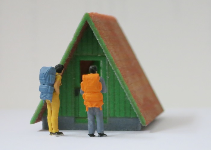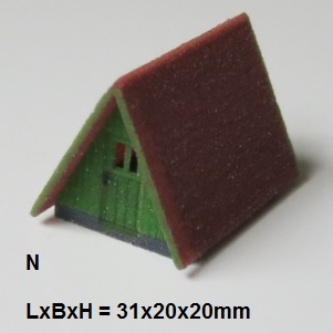 Die Hütte steht auf einem Betonsockel. Stirnseiten in Bretterbauweise; eine Seite mit Tür, gegenüber nur ein Fenster. Das Dach ist mit roten Dachpappe-Schindeln gedeckt. Die Größe ist so gewählt, daß es nicht nur als Geräteschuppen verwendet werden kann, sondern auch als kleiner Bungalow oder Gartenlaube.