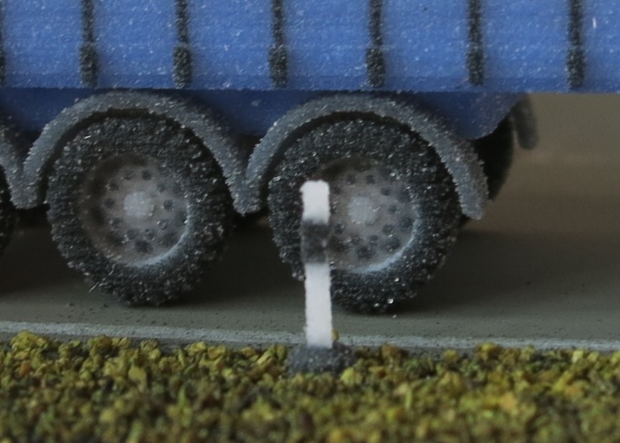 DB - Die Modelle zeigen die aktuell üblichen Plastik-Balken. In den Maßstäben, wo diese dargestellt sind, ist je Satz ein Exemplar mit gelben Reflektoren dabei. Diese stehen vor und hinter Straßeneinmündungen. Wer den Konus nicht völlig im Straßengraben versenkt sondern die obere Kante etwas heraus ragen lässt, hat gleich die Plastikmanschette mit abgebildet, die den Unkrautwuchs unterbinden soll.